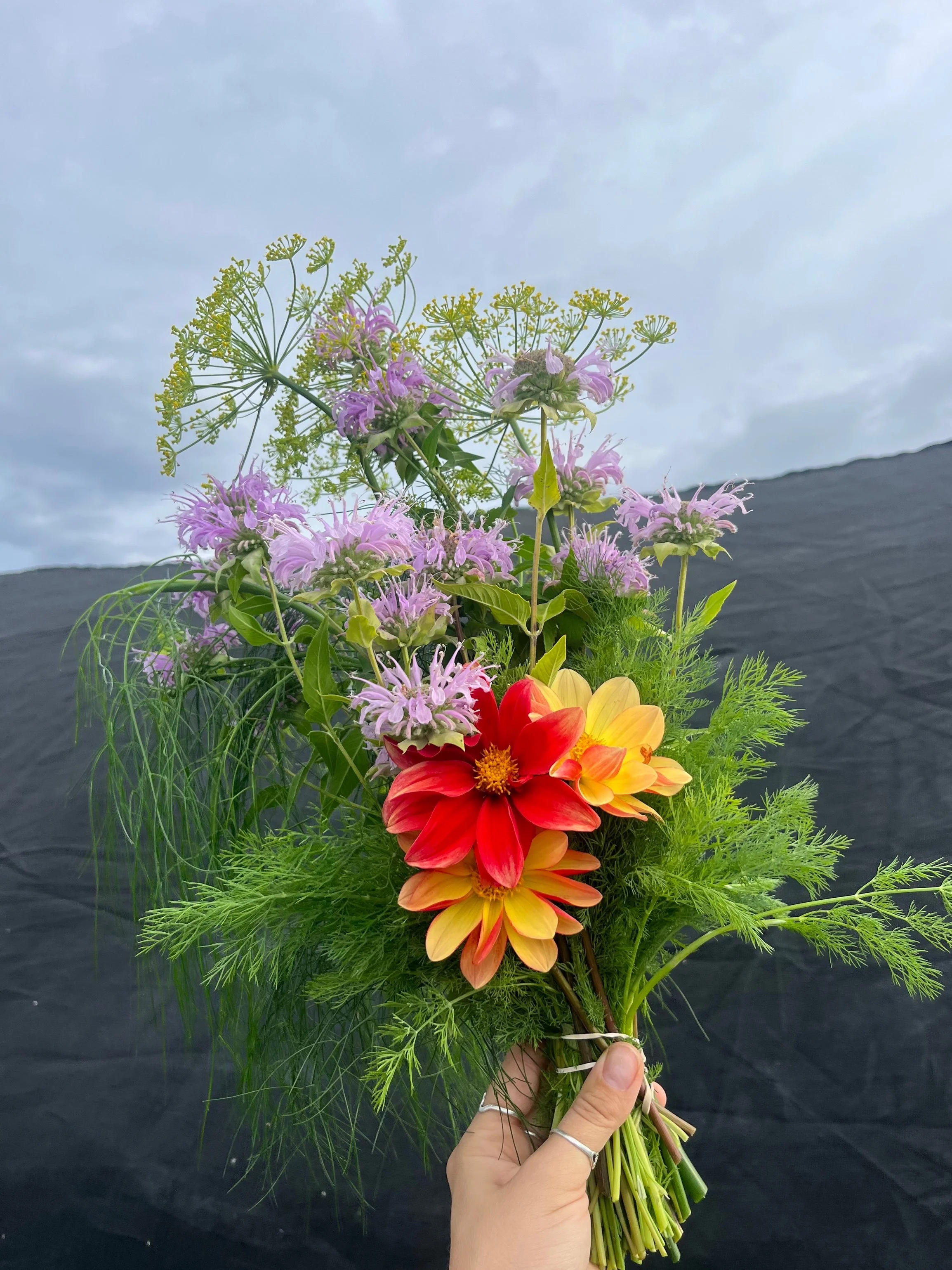 This week, our featured herb in the bouquet is dill! Complemented by some dill seed, fennel and bee balm/ dahlias for a nice pop of colour.
