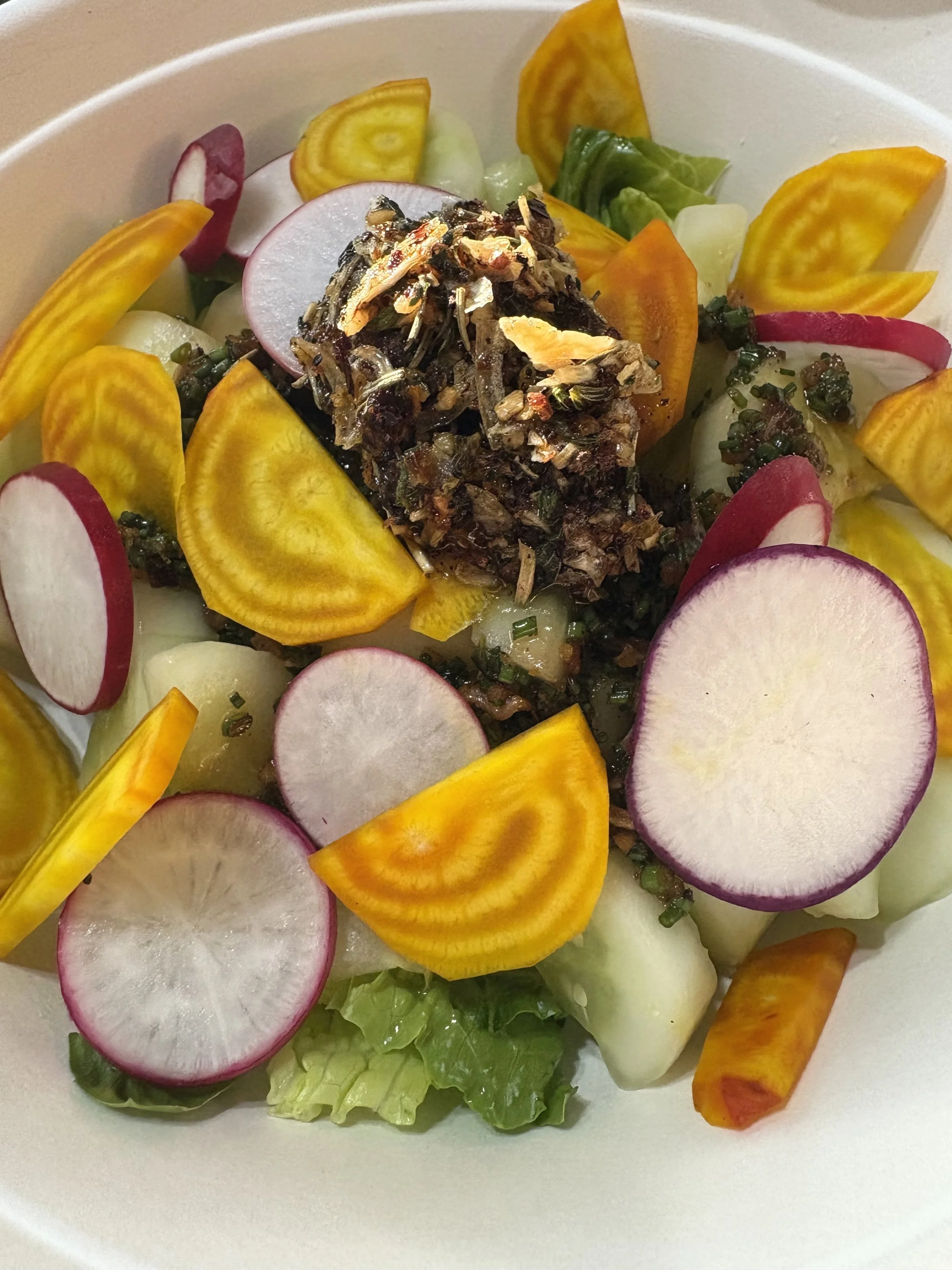 Marinated cucumber with radishes, beets and chilli herb crunch!